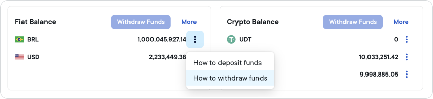 Find the currency you want to withdraw, then click the options menu icon (⋮) to the right of the balance.