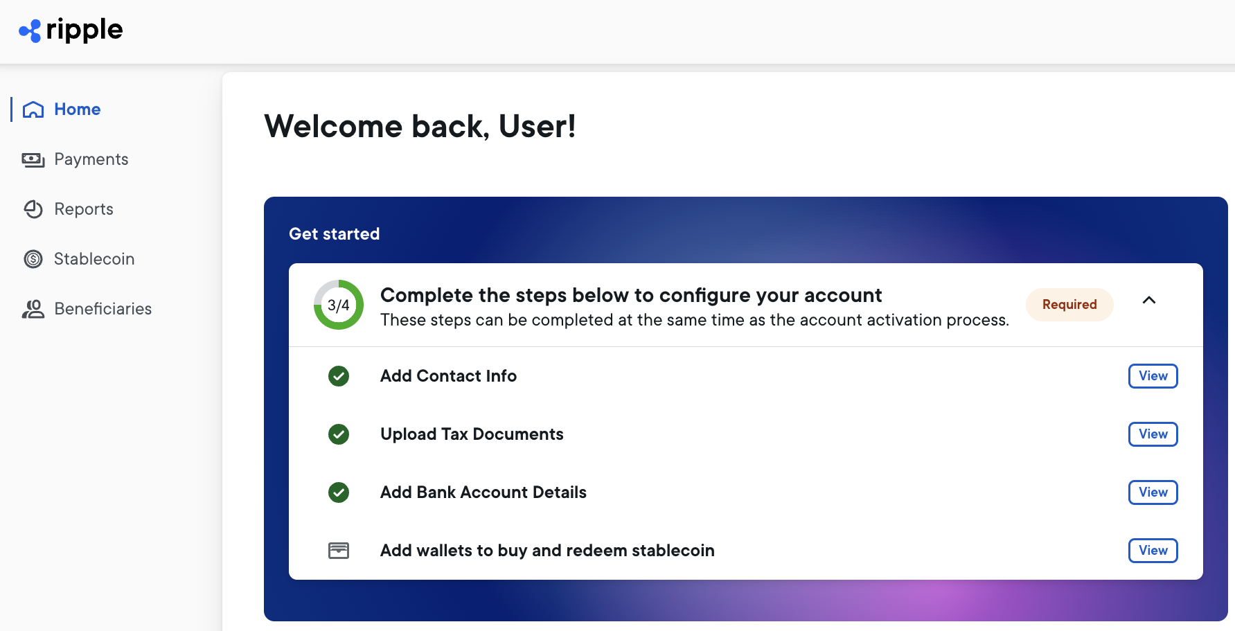 All Ripple Payment products, as well as Ripple Stablecoin, use the same unified login process for both administrators and basic users, as well as for access to product support.