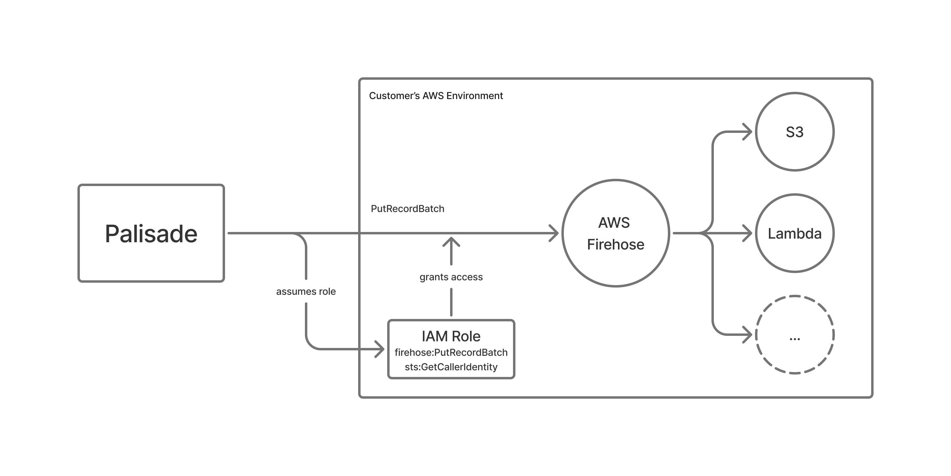 Customer configures an IAM role and a firehose endpoint in Organization settings. During the upload, the following environment specific IAM roles assume the customer configured IAM roles in order to perform PutRecordBatch on the configured firehose endpoint.