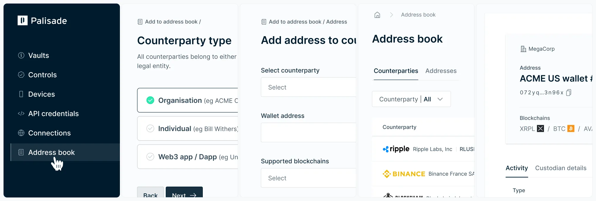 Address book is designed to help you manage your counterparties and their on-chain presence. Today, it covers counterparties like an organisation, an individual or an on-chain dapp. All entries in address book are global by default. Address book entries can be associated with any wallet across the platform using policies.